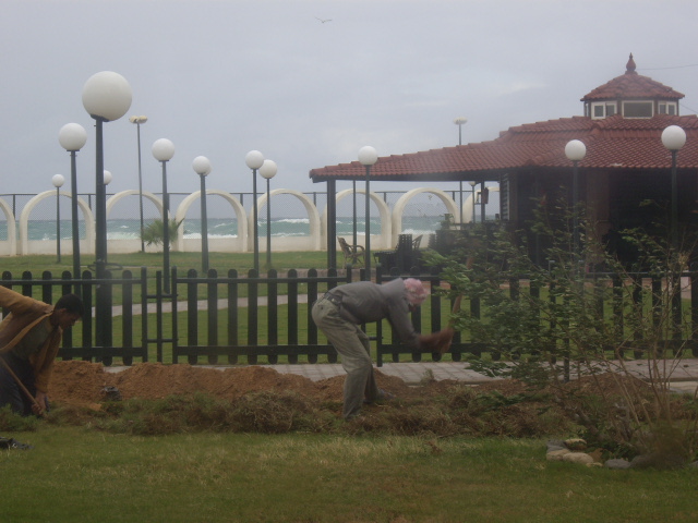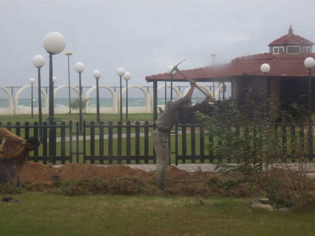На заднем дворе гостиницы работают киркой