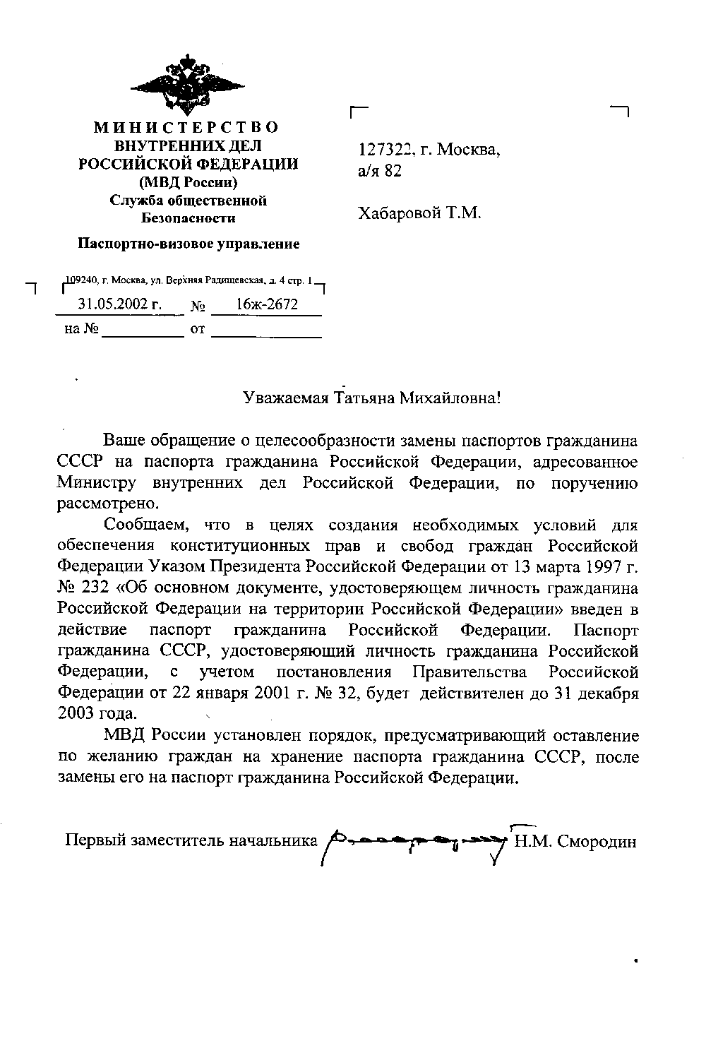 Отныне гражданин Росийской Федерации при получении нового росийского паспорта вправе оставить паспорт СССР себе "на хранение". Об этом сообщается в ответе первого заместителя начальника Паспортно-визового управления МВД РФ Н.М.Смородина на запрос Т.М.Хабаровой. Сылаться следует на распоряжение или письмо МВД РФ N 1/2807 от 15 мая 2002 года.