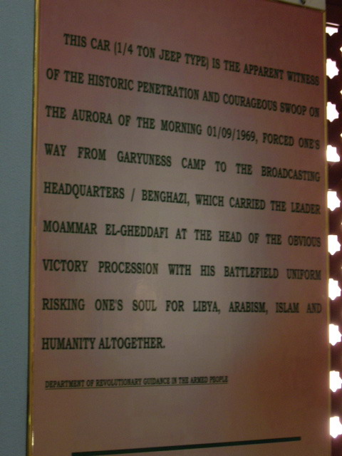 На этом автомобиле Муаммар Каддафи 1 сентября 1969 года на рассвете приехал из казарм Гар Юнес на Радио Триполи, чтобы объявить о победе революции