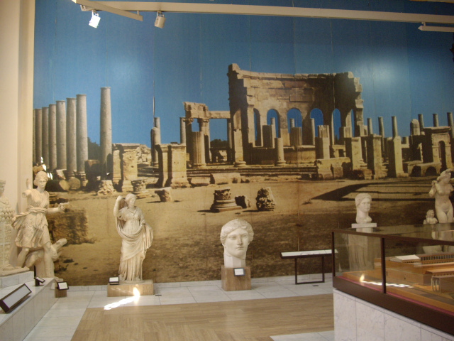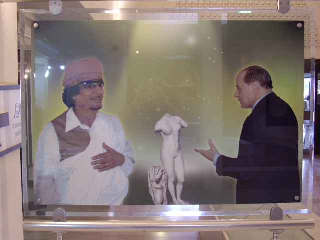 У входа в музей. Сильвио Берлускони возвращает Ливии Венеру, вывезенную итальянскими оккупантами в начале XX века. С другой стороны от входа блоыы раннее фото: Муаммар Каддафи ставит перед предшественником Берлускони Массимо д'Алемой вопрос о возврате Венеры. Италии пришлось выкупить статую у Германии, потому что Муссолини в своё время подарил её Гитлеру